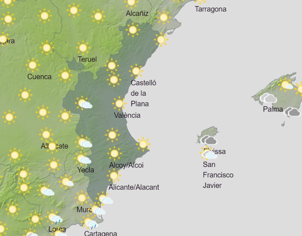 Así lo recoge la previsión de la Agencia Estatal de Meteorología (Aemet), que prevé asimismo viento del noroeste moderado que amainará a flojo en el norte de Castellón, viento del este y sureste moderado en el litoral alicantino y variable flojo en el resto, con predominio de la componente este en la segunda mitad del día.