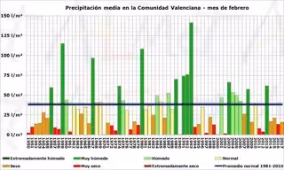 Los observatorios de más precipitación acumulada en el mes de febrero en la red Aemet fueron Fredes, con 40.8 l/m2, y Morella, con 32 l/m2; mientras que los mínimos se observaron en el sur de Alicante: en Origuela, 2.2 l/m2; Torrevieja, 2.4 l/m2 y Crevillent, 3.5 l/m2.