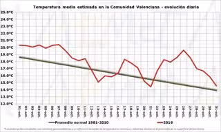 Aunque los valores más altos se registraron a principio de mes, con temperaturas que los días 4 y 6 superaron los 32 grados en localidades del interior (Ontinyent, 34 grados; Xàtiva, 33,5; Villena, 33.0; Barxeta, 33; Bicorp 32,8), la mayor desviación con respecto a la media (+5.5ºC) se observó el día 26, debido sobre todo a temperaturas nocturnas altas que, para el caso de Alicante, supusieron la noche más cálida en una fecha tan avanzada del año de los últimos 31 años, desde noviembre de 1985.