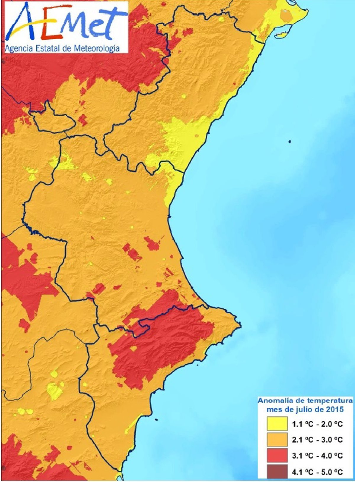 Según Aemet, en toda la Comunitat las temperaturas estuvieron por encima de los valores normales. La mayor anomalía se observó en la montaña del norte de Alicante y sur de Valencia y en zonas del interior norte de Castellón, donde la media del mes de julio fue entre tres y cuatro grados superior a lo normal. Sólo las brisas marítimas suavizaron algo el ambiente en muchas localidades del litoral norte, donde la anomalía térmica fue algo inferior a dos grados.