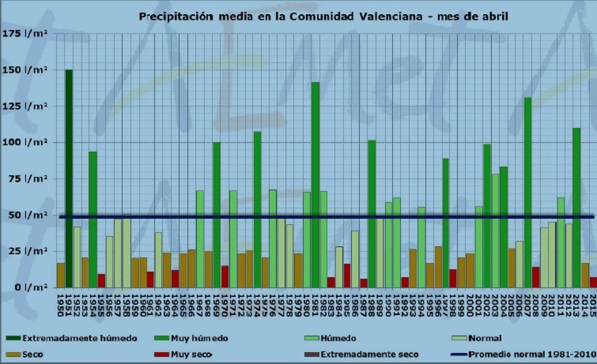 El mes de abril de 2015 ha sido un mes muy cálido y muy seco en la Comunidad Valenciana. La temperatura media ha sido 14 grados centígrados, que es un grado más alta que el promedio normal, mientras que la cantidad que media estimada de precipitación ha sido de 7,3 litros por metro cuadrado, que es un 85 por ciento inferior al valor climatológico normal.