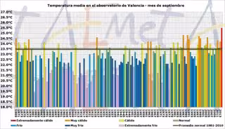 No obstante, según Aemet, a pesar de la notable bajada de temperaturas de la última decena del mes, septiembre de 2014 es el más cálido desde el año 1987 en el promedio del territorio, aunque en observatorios del litoral de Valencia y Castellón, es el más cálido desde que hay datos.