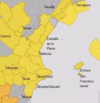El aviso meteorológico amarillo está activo en todo el territorio salvo el litoral norte de Castellón. Se esperan rachas de 80 kilómetros por hora en las tres provincias. Soplará viento del oeste y del noroeste, de moderado a fuerte con rachas muy fuertes.