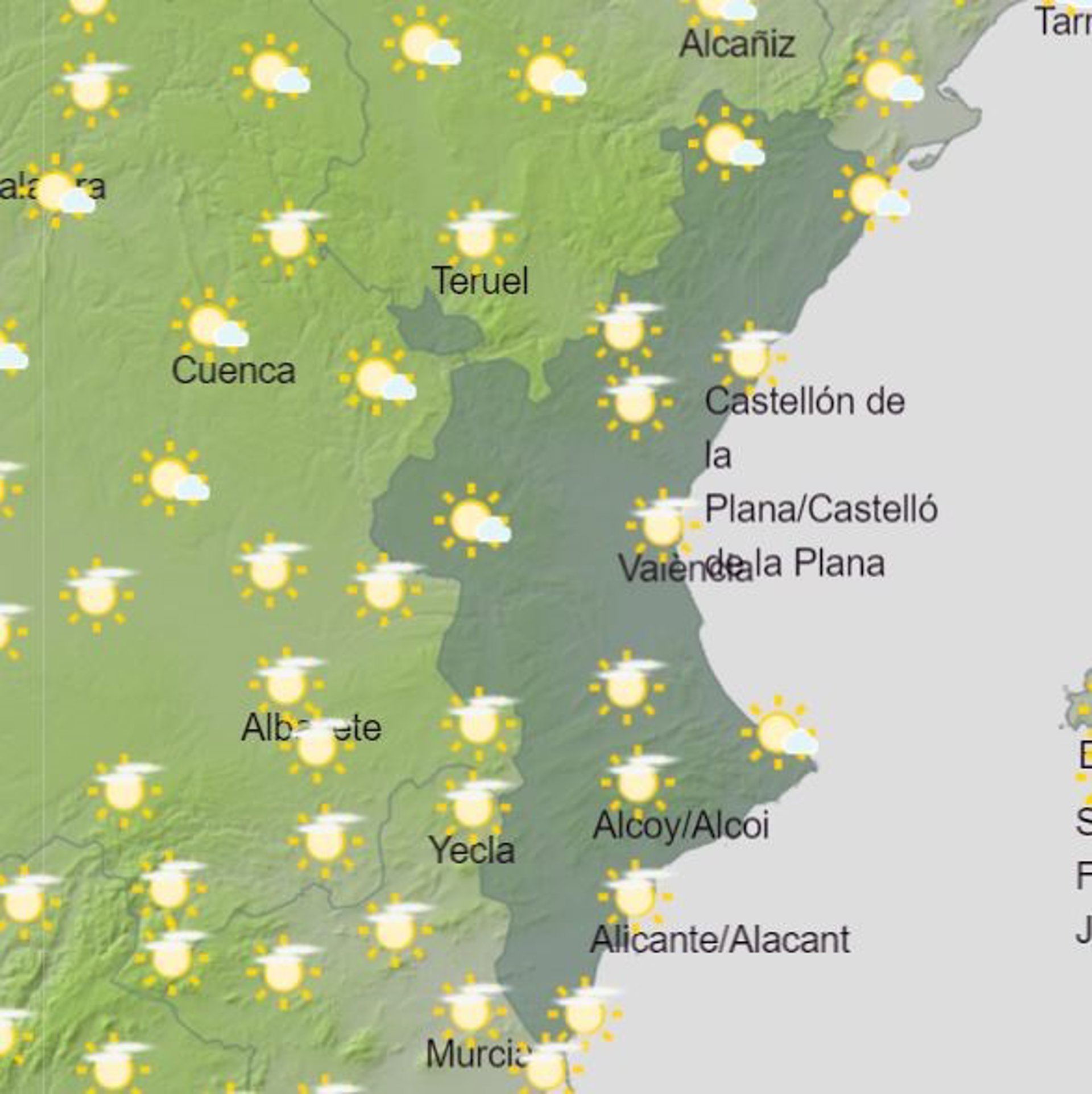 En cuanto a las mínimas, las más frescas se encuentran en Morella también, con 11; en los municipios valencianos de Requena y Ontinyent, con 12, y en Alcoi (Alicante), con 13. En el lado contrario se sitúa Valncia, que no bajará de los 18 grados.