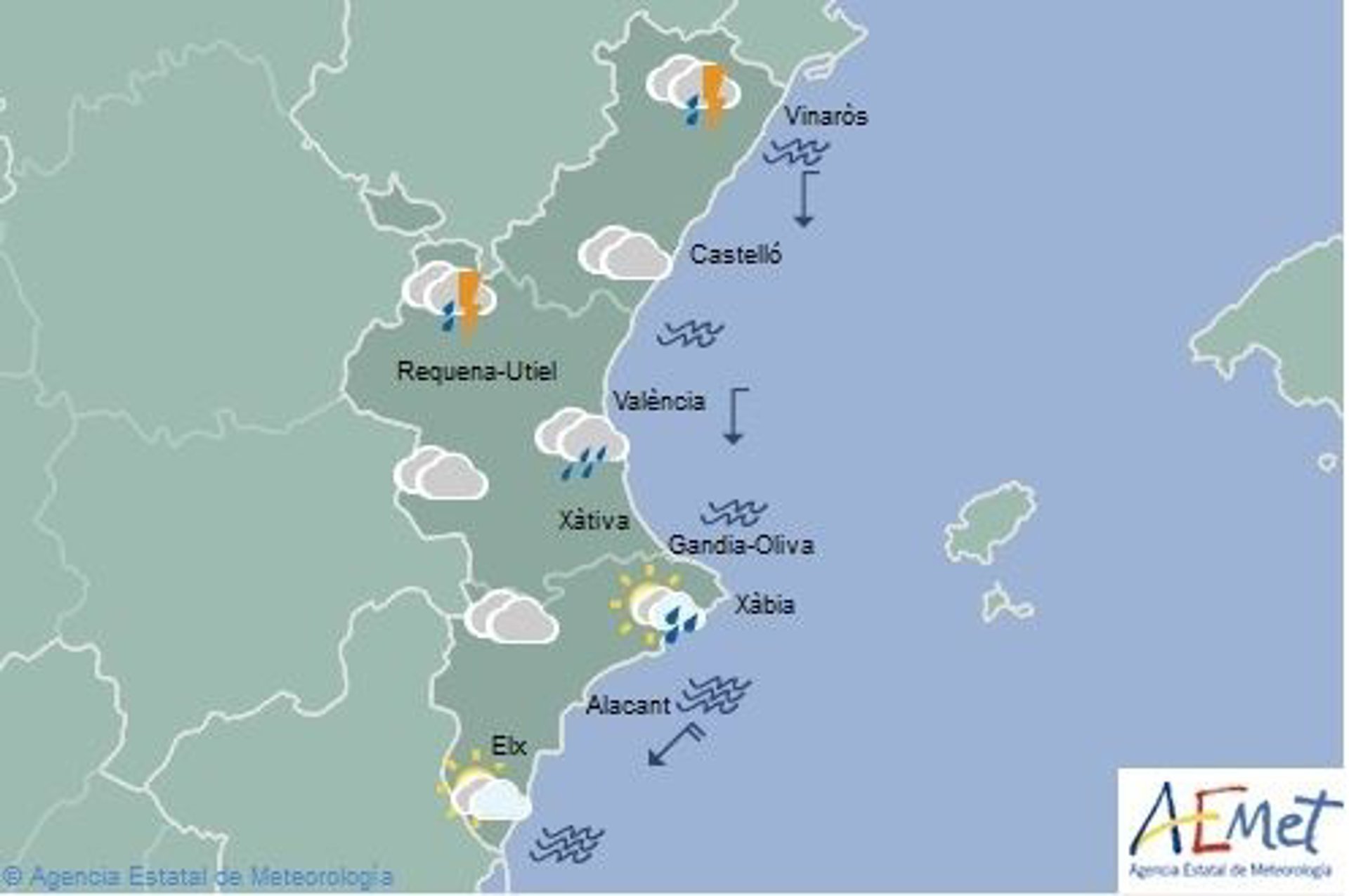 La Comunitat Valenciana registrará chubascos este sábado y tormentas ocasionales que pueden ser localmente fuertes en la mitad norte del territorio, según la predicción de la Agencia Estatal de Meteorología (Aemet).