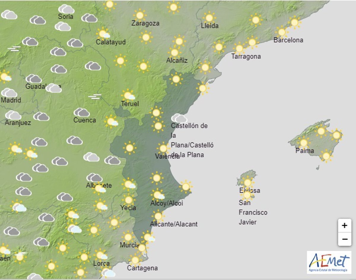 Según la predicción de la Agencia Estatal de Meteorología, la temperatura máxima prevista son los 25 grados que tendrán Alicante y Valncia. Elche, Orihuela y la Vall d'Uixó se quedarán en 24; Dénia en 23; Gandia tendrá 22 y Castelló, 21. Morella registrará la máxima más baja, con 17 grados.
