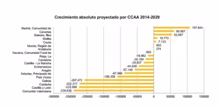 Por el contrario, la población aumentaría en Comunidad de Madrid, Canarias, Islas Baleares y en las ciudades autónomas de Ceuta y Melilla. Comunidad Foral de Navarra (-0,2%), Andalucía (0,0%) y Región de Murcia (0,1%) prácticamente mantendrían el mismo tamaño poblacional que en la actualidad.