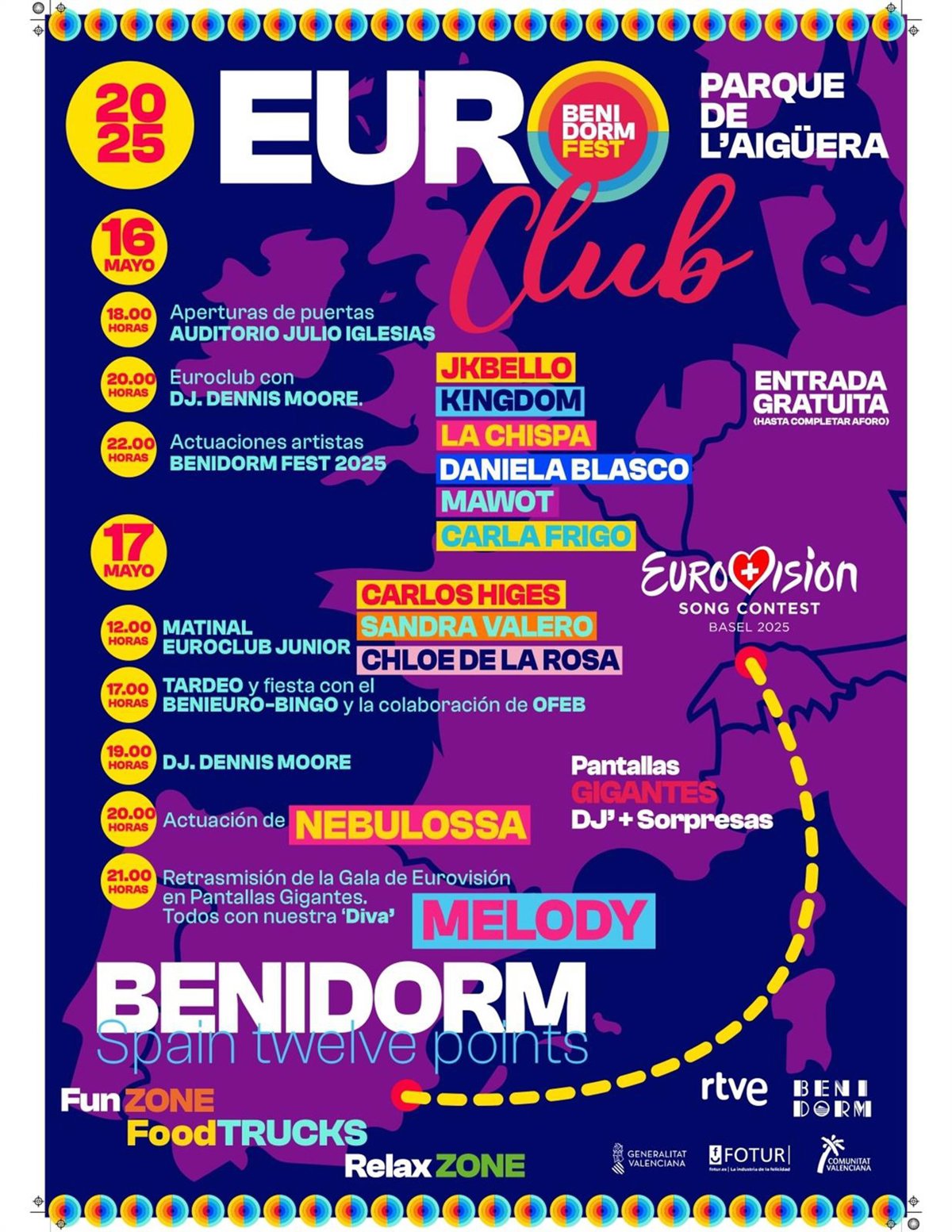 Por otro lado, el auditorio Julio Iglesias del Parque de l'Aigüera de Benidorm (Alicante) albergará el Euroclub los días 16 y 17 de mayo, con diversas actuaciones. Así, se prevé que actúen artistas como JKBello, K!ngdom, La Chispa, Daniela Blasco, Mawot, Carla Frigo, o Nebulossa.