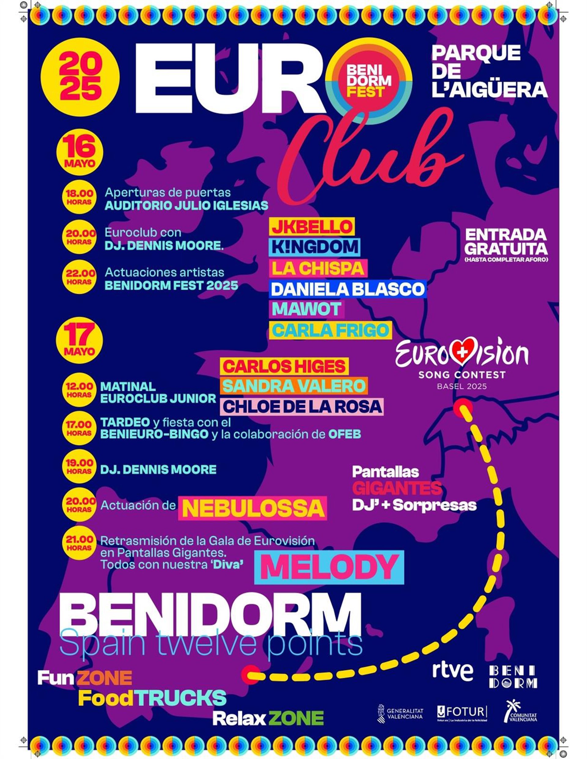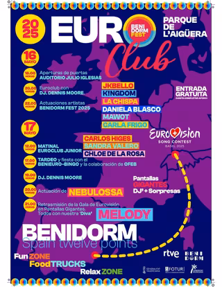 "Debido al éxito del año pasado se amplía el Euroclub de Benidorm de uno a dos días, con un cartel donde actuarán artistas que participaron en el Benidorm Fest 2025 y los ganadores de la edición de 2024", ha resaltado Cano, al tiempo que ha añadido que la entrada al Euroclub Benidorm es gratuita y "se ha incluido programación en horario matutino para incluir al público infantil y familiar".
