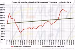 Las temperaturas medias más altas del mes de marzo en la Comunitat se registraron los días 2 y 26, con casi 14 y algo más de 15 grados centígrados, respectivamente. Por su parte, la temperatura media más baja la marcaron los termómetros el día 7 con unos 6,5 grados.