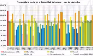 Ha sido el mes de noviembre más cálido de la década y el décimo más cálido de la serie histórica, desde 1950. Según ha explicado Aemet, este año el clima en la Comunitat está tenido un carácter "muy cálido o extremadamente cálido". De hecho, el periodo de once meses entre enero y noviembre es el segundo más cálido de la serie, solo por detrás de 2014.