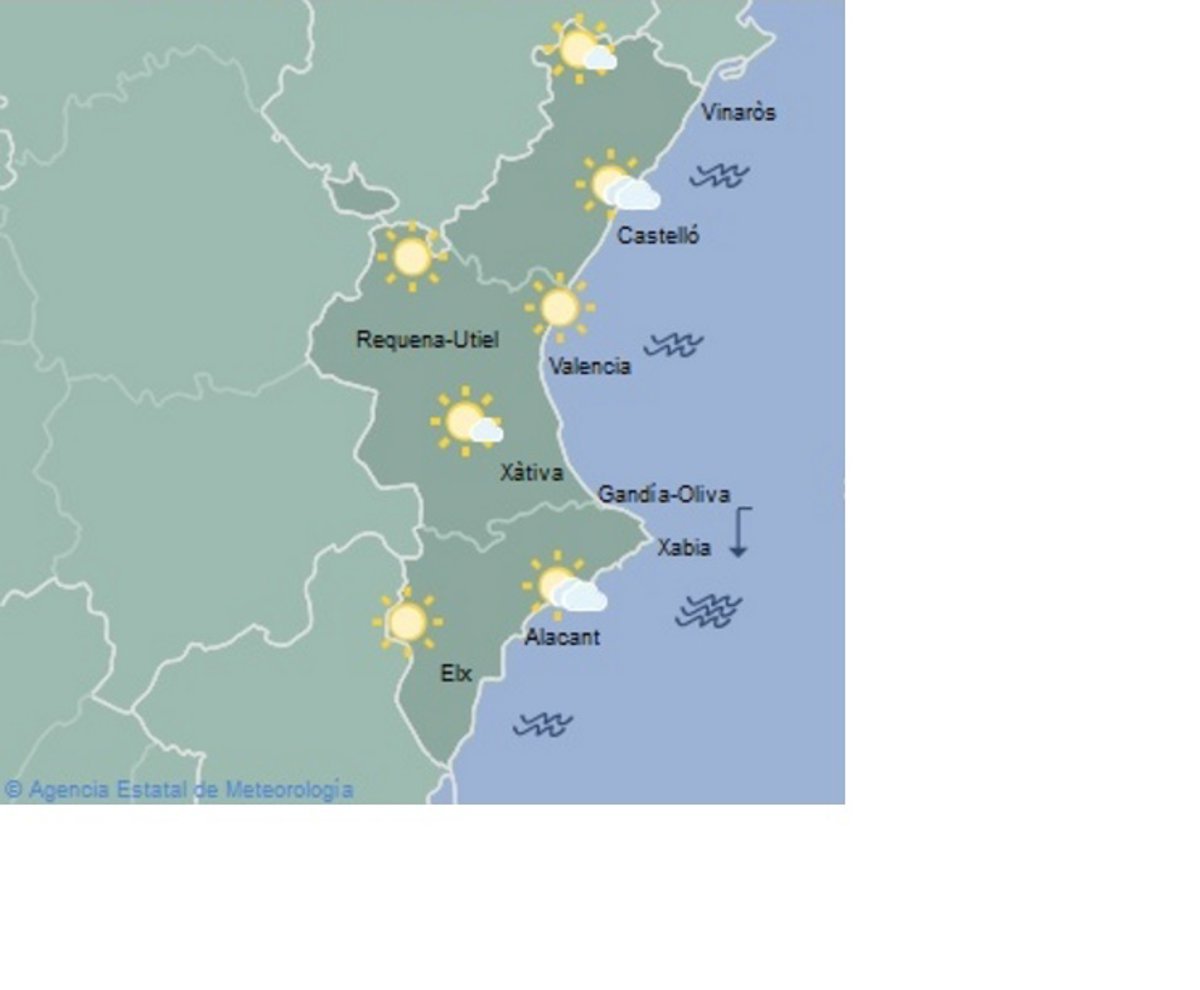 La Comunitat Valenciana tendrá este lunes cielo poco nuboso y temperaturas máximas en descenso, sobre todo en el interior, mientras que las mínimas se mantendrán sin apenas cambios, según la predicción facilitada por la Agencia Estatal de Meteorología (Aemet).