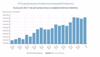 En total, en la Comunitat Valenciana se alojaron un total de 1.034.541 viajeros en establecimientos hoteleros, un 5,2% más que en julio del año pasado, y que realizaron un total de 3.653.067 pernoctaciones, 94.196 más que en el mismo mes del año anterior. La estancia media fue de 3,5 días.