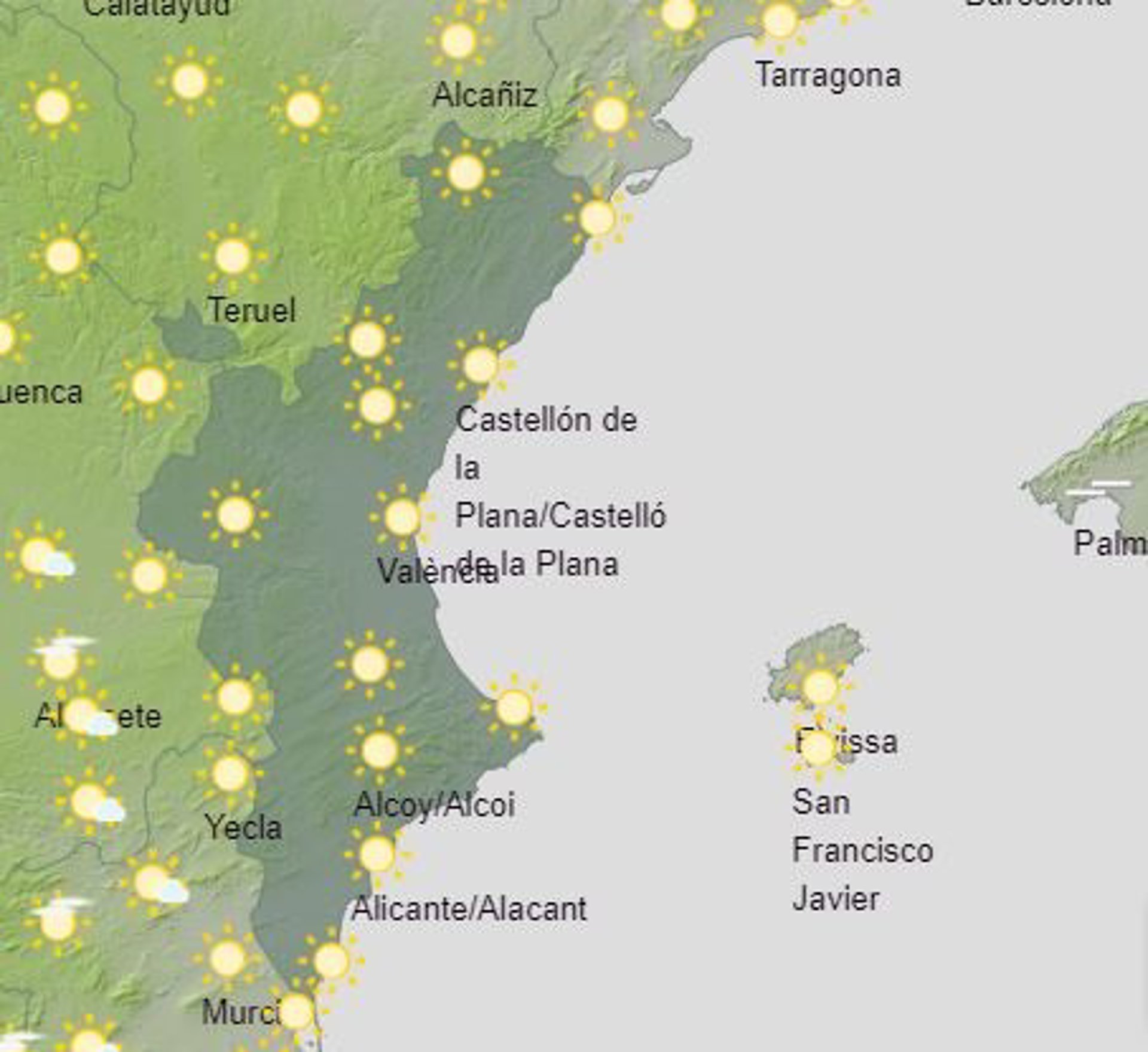 Según la predicción de la Agencia Estatal de Meteorología (Aemet), predominarán los cielos poco nubosos o despejados. En el litoral sur de Alicante, habrá brumas y bancos de niebla dispersos.