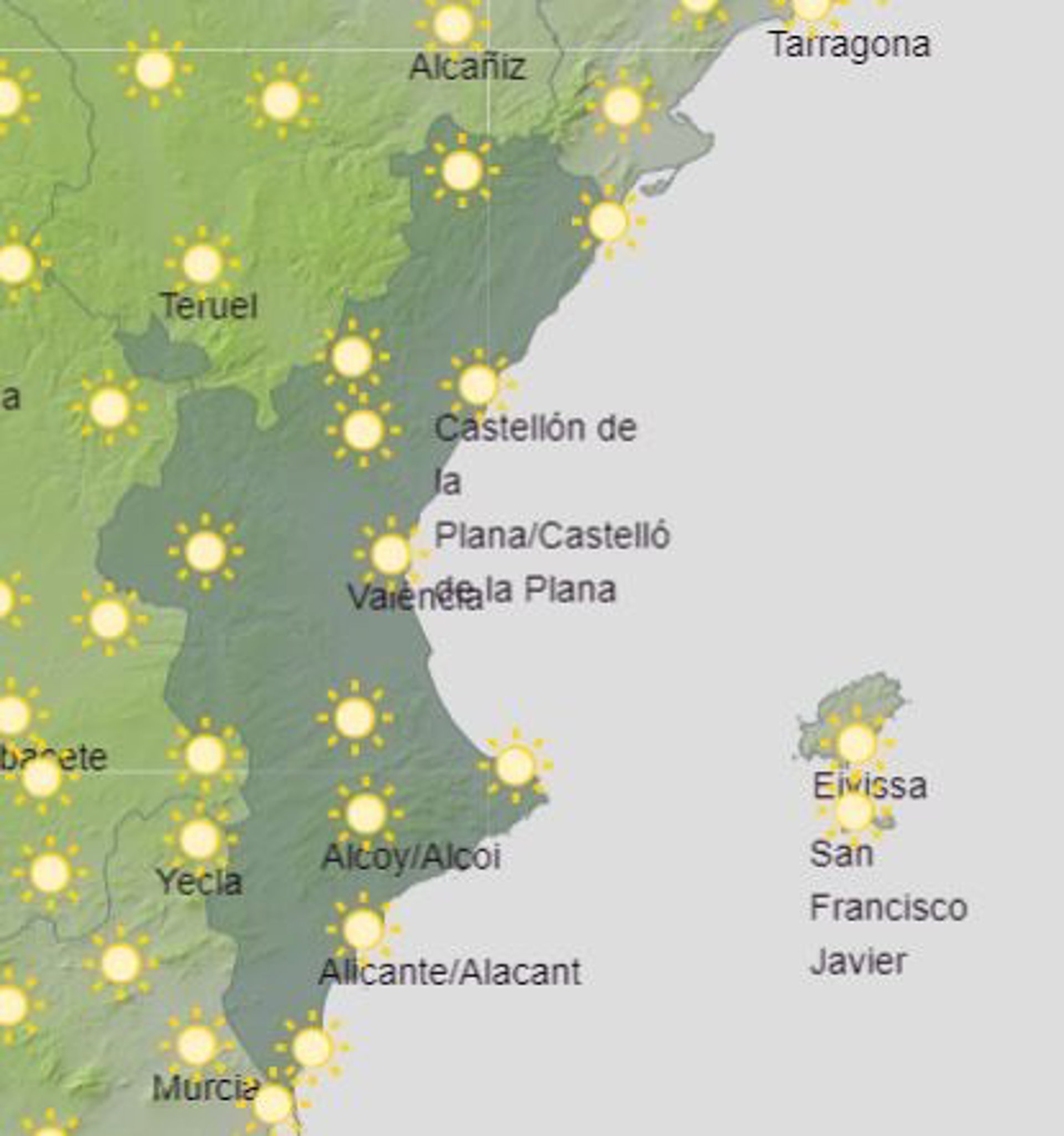 La provincia de Valencia, por lo general, tendrá 27 grados de máxima, aunque las mínimas pueden situarse en los 12 grados. Más elevada será la temperatura en Ontinyent, que puede alcanzar los 28 grados, con una mñinima de 12 grados.