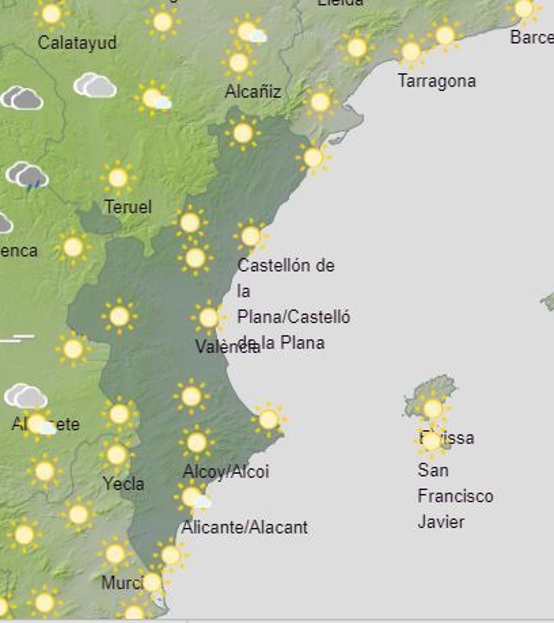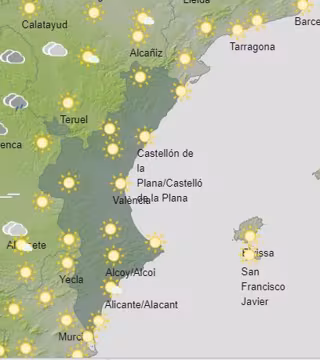 En cuanto a las temperaturas, este domingo no se esperan grandes cambios. Por lo general, las máximas rondarán los 30 grados. Los valores más elevados se esperan en los observatorios de Elche (Alicante) y Valncia, con 32 grados. En el lado contrario, las más frescas se darán en Morella (Castellón), con 24 grados, y Requena (Valencia), con 26 grados.