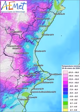 Las mínimas nocturnas en la Comunitat Valenciana han sido suaves en el litoral, donde no han bajado de los 10 grados por la nubosidad y el aire relativamente cálido, mientras que hace una década se registró una noche gélida, con mínimas de hasta 19 grados bajo cero en el interior.