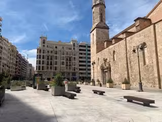 Las obras de peatonalización provisional de la Plaza de San Agustín de Valncia, que han incorporado mobiliario y vegetación, han concluido.