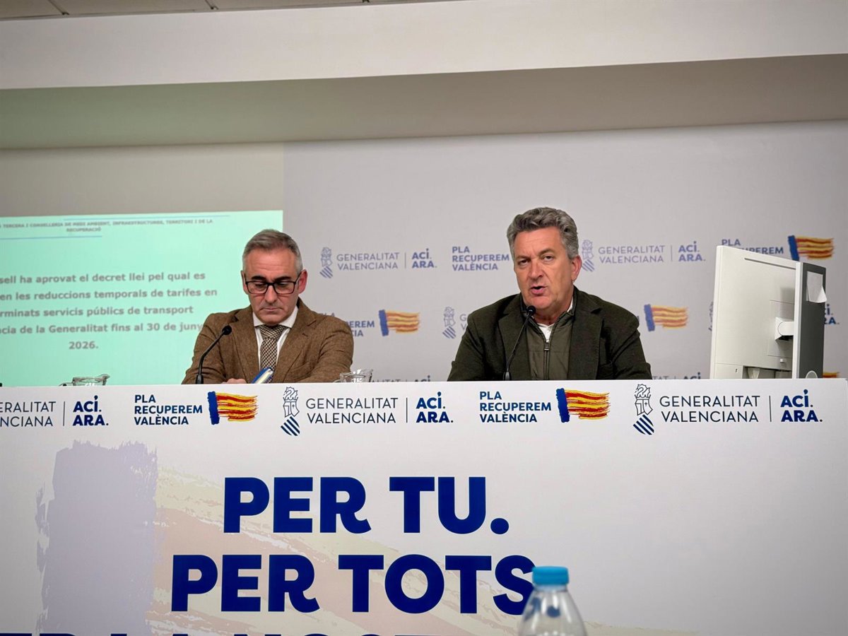 El portavoz del Consell, Miguel Barrachina, y el conseller para la Recuperación y de Medio Ambiente, Infraestructuras y Territorio, Vicente Martínez Mus, en la rueda de prensa posterior al pleno del Consell - GVA