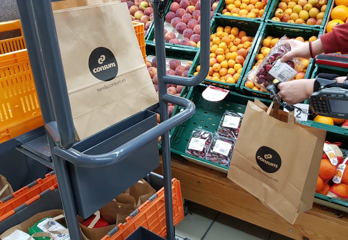 Consum ha eliminado las bolsas de plástico de su tienda online, de manera que, a partir de mañana, todos los pedidos que se hagan a través de la plataforma de compra electrónica se entregarán con bolsas de papel reciclado aptas para la alimentación.