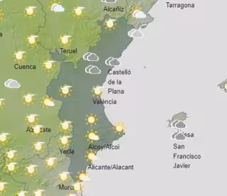 Finalmente, en Alicante, se esperan máximas de 34 en Orihuela, 32 en Elche, 29 en Dénia y Alicante, y 28 en Alcoi. Las mínimas serán de 15 en Alcoi, 18 en Elche y Orihuela, 19 en Dénia, y 20 en Alicante.