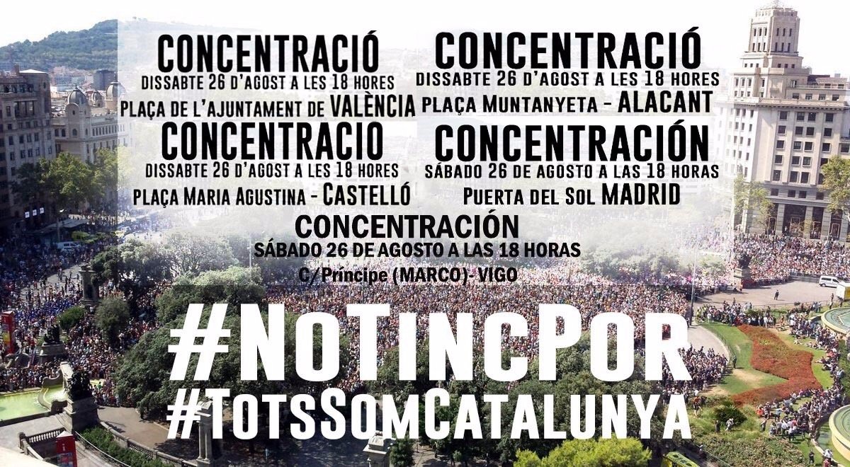 Bajo el lema 'No tengo miedo' y 'Todos somos Cataluña', entidades como la plataforma Recortes Cero han convocado movilizaciones con el mismo objetivo y a la misma hora que la prevista en Barcelona en el cruce de la avenida Diagonal con el Paseo de Gracia.