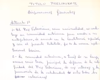 Las Corts Valencianes han digitalizado y puesto al alcance de los usuarios el documento original 'Estatut d'Autonomia. Papers de Treball', que incluye el borrador manuscrito y los documentos 'Enrique' y 'Palancia'.