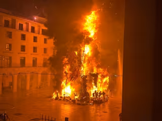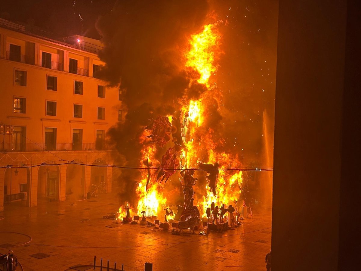 El numeroso público congregado fuera del perímetro de seguridad de la Plaza del Ayuntamiento se sorprendió ante ese simulacro de incendio que se ha ido apagando de manera paulatina. Mientras, la parte superior de 'Identidad' siguió ardiendo hasta que ha comenzado a estallar la traca final y se ha hecho visible el fondo de fuegos artificiales. Estos precedieron a las llamas que han consumido, progresivamente, una 'Identidad' que ha merecido múltiples elogios de quienes se han acercado a la Plaza del Ayuntamiento durante estas Hogueras 2025.