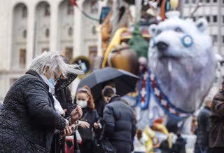 Varias personas, algunas con paraguas, pasan por delante de la falla grande del Ayuntamiento de Valncia 2022. - Rober Solsona - Europa Press