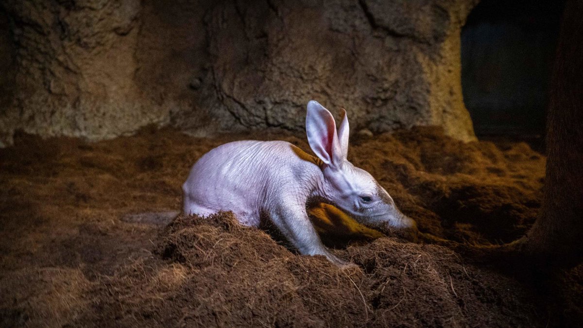 Hocico parecido al de cerdo, orejas de conejo, cola similar a la de un canguro, garras de dinosaurio y una pegajosa lengua. Así es el 'bebé' oricteropo de Bioparc València, que ya ha llegado a su primer mes de vida y ya se puede contemplar en la madriguera junto a su madre.