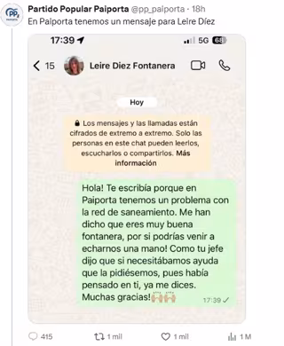El PP de Paiporta (Valencia), una de las localidades más afectadas por la dana del pasado 29 de octubre, ha hecho público en la red social X la captura de un mensaje supuestamente enviado vía WhatsApp a la exmilitante del PSOE Leire Díez, a la que le piden que como "fontanera" acuda al municipio a "echar una mano" ante los problemas en la red de saneamiento y el alcantarillado a consecuencia de la riada de hace siete meses. Un textoe que ha provocado las críticas del ministro Óscar Puente y de varios dirigentes del PSOE y de otros partidos como Compromís o ERC.