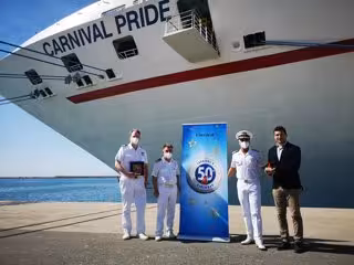 El crucero Carnival Pride, de la naviera Carnival Cruise Line, ha realizado su primera escala en el Puerto de Valncia. El responsable de Comercial y Desarrollo de Negocio de la Autoridad Portuaria de Valncia (APV), Andrés Morro, ha sido el encargado de entregar el tradicional socarrat --la baldosa valenciana de barro cocida diseñada con motivos marítimos que Valenciaport entrega a los buques que atracan por primera vez en sus instalaciones-- al capitán del crucero Rino Costanzo.