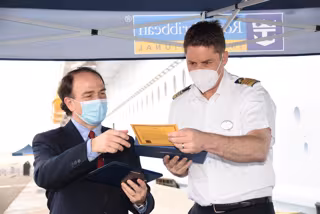El responsable de Comercial y Desarrollo de Negocio de la Autoridad Portuaria de Valncia (APV), Rafael Romero, ha sido el encargado de entregar el tradicional socarrat --la baldosa valenciana de barro cocida diseñada con motivos marítimos que Valenciaport entrega a los buques que atracan por primera vez en sus instalaciones-- al capitán del crucero Hernik Loy.