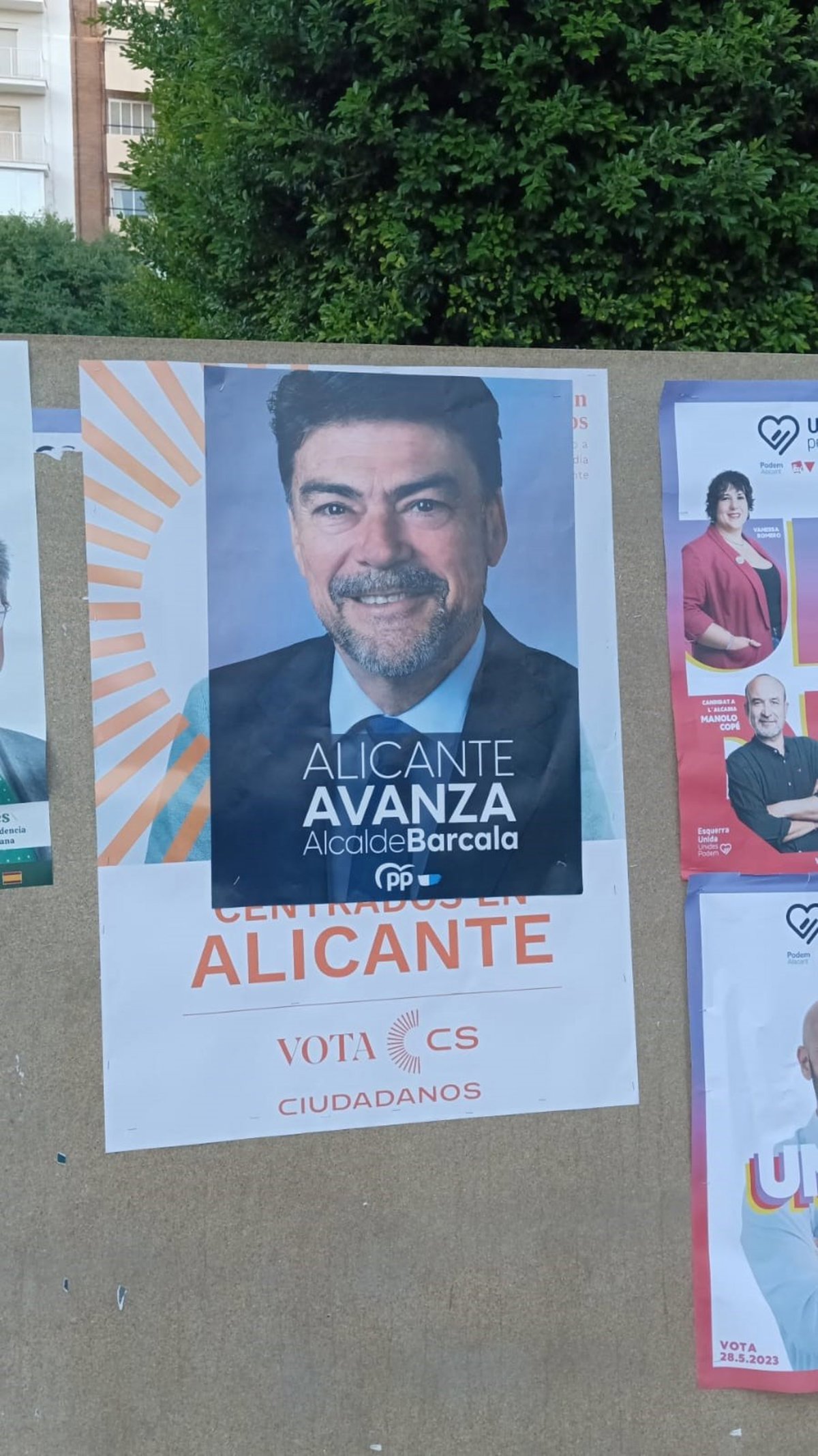 La formación 'naranja', que actualmente gobierna en coalición con el PP en el Ayuntamiento de Alicante, ha asegurado que en lugares donde estaba colocado un cartel con la imagen del alcaldable de CS, Adrián Santos, se han puesto por encima carteles del PP, por lo que considera que se "vulnera la libertad de publicidad electoral".