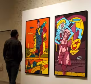 En los trabajos más recientes, se aprecia que los colores, siempre poderosos en la obra del autor italiano, se vuelven aún "más brillantes", mientras que la línea cerrada --otra de las 'marcas de la casa' del italiano-- adquiere un mayor grosor, ha explicado Molins.