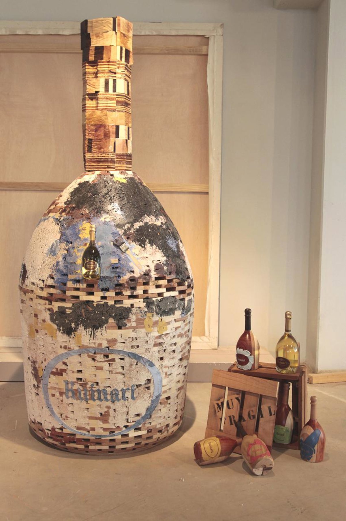 La obra principal, una botella realizada en diferentes clases de madera, refleja un trabajo artesanal y de composición propia, que mezclado con el concepto más moderno de inclusión de elementos adicionales propios del arte, refuerzan su sentido escultórico.