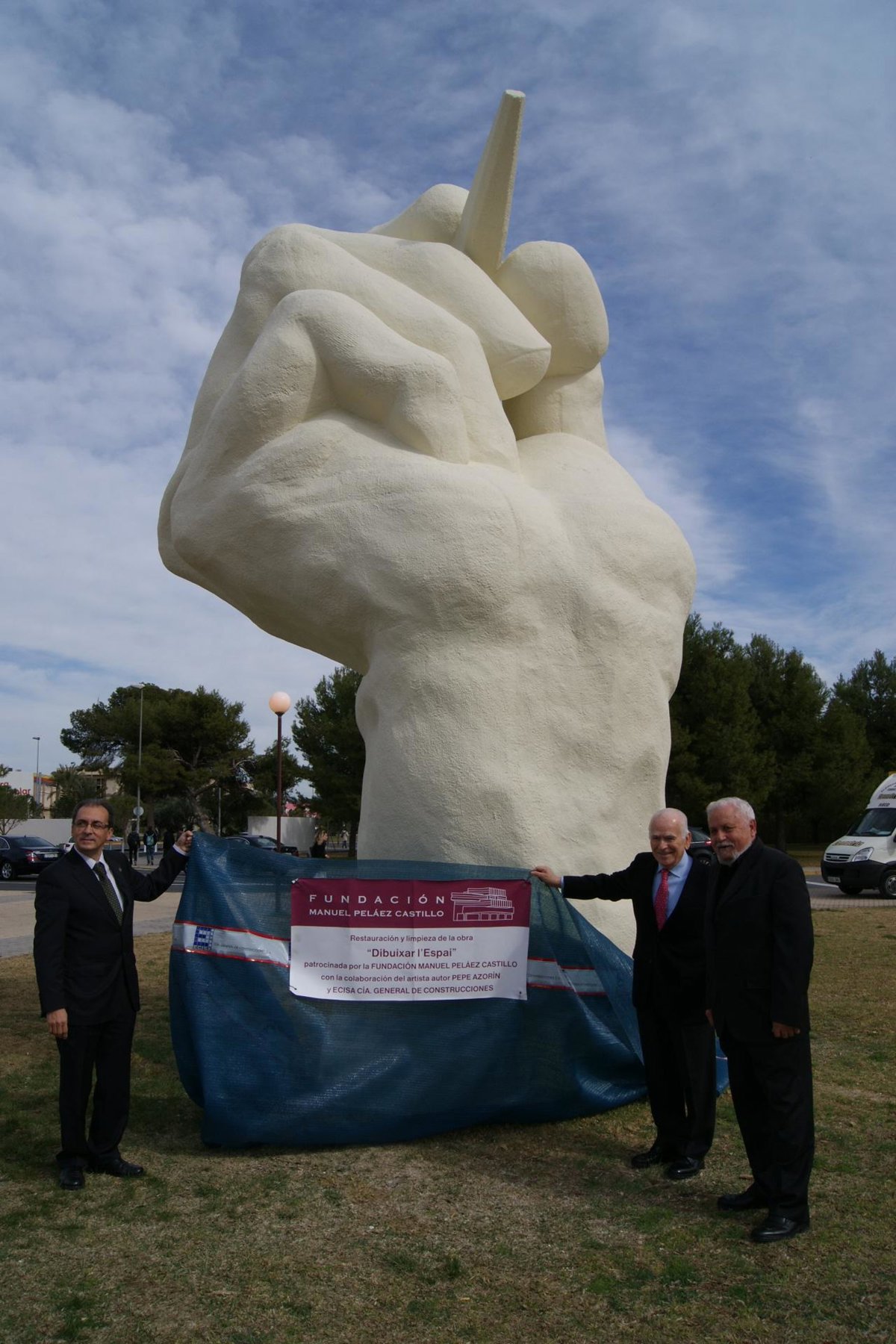 La restauración de la mano ha finalizado después de que comenzaran hace dos semanas los primeros trabajos de mantenimiento. El proyecto de recuperación de esta escultura forma parte del convenio marco que la Fundación Manuel Peláez Castillo tiene suscrito con la Universidad de Alicante.