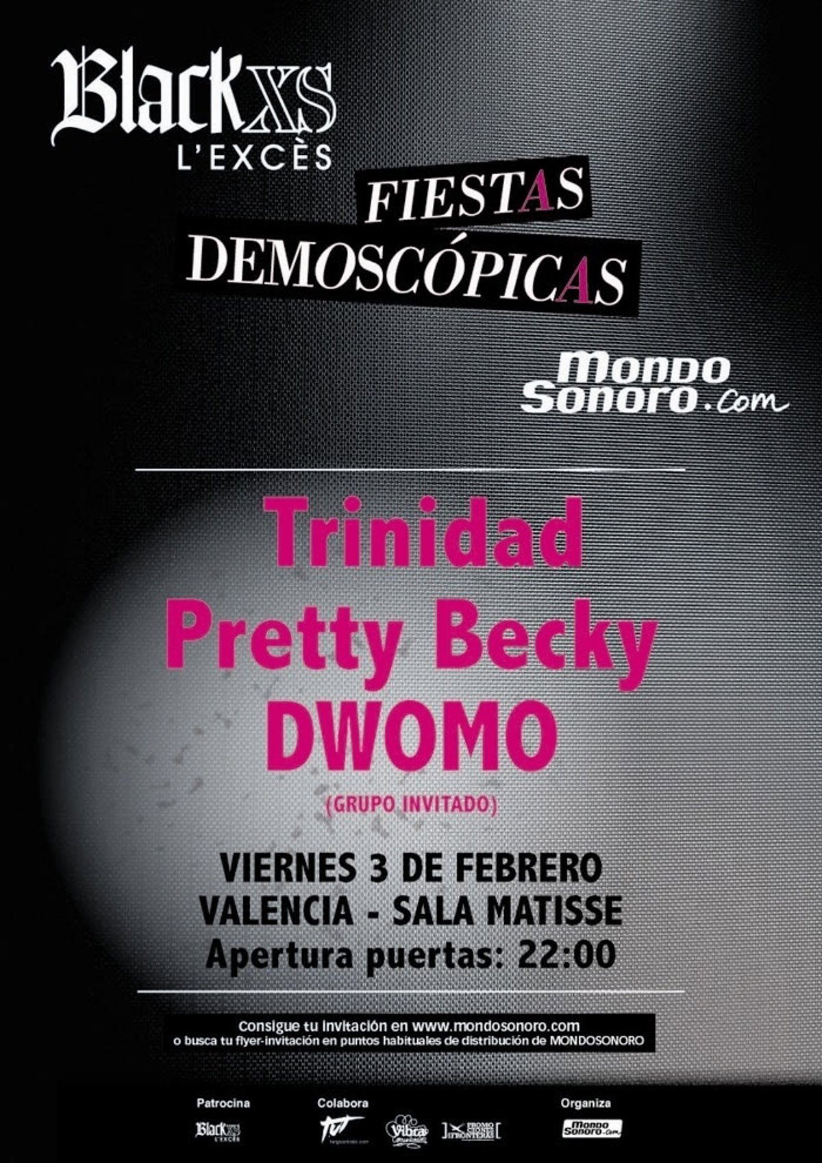 La Sala Matisse de Valencia será el escenario este viernes a partir de las 22.00 horas de la primera cita de las Black XS Fiestas Demoscópicas de MondoSonoro de 2012, un ciclo de conciertos con el que la veterana publicación pretende "dar un empujón" a los nuevos artistas. En la capital del Turia actuarán Trinidad, Pretty Becky y Dwomo como grupo invitado.