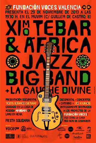 El acto se desarrollará a partir de las 19.30 horas y contará con la colaboración del guitarrista Ximo Tebar y su banda Africa Jazz Dance Big Band, con una producción interétnica donde más de 20 músicos y bailarines mostrarán la fusión cultural del jazz mediterráneo con la música africana y en la que artísticamente destaca la combinación de ambientes como el cello, el instrumento africano kora y voces africanas que interpretarán clásicos de reconocidos compositores como Wayne Shorter o Miriam Makeba. Los valencianos La Gauche Divine actuarán como teloneros.