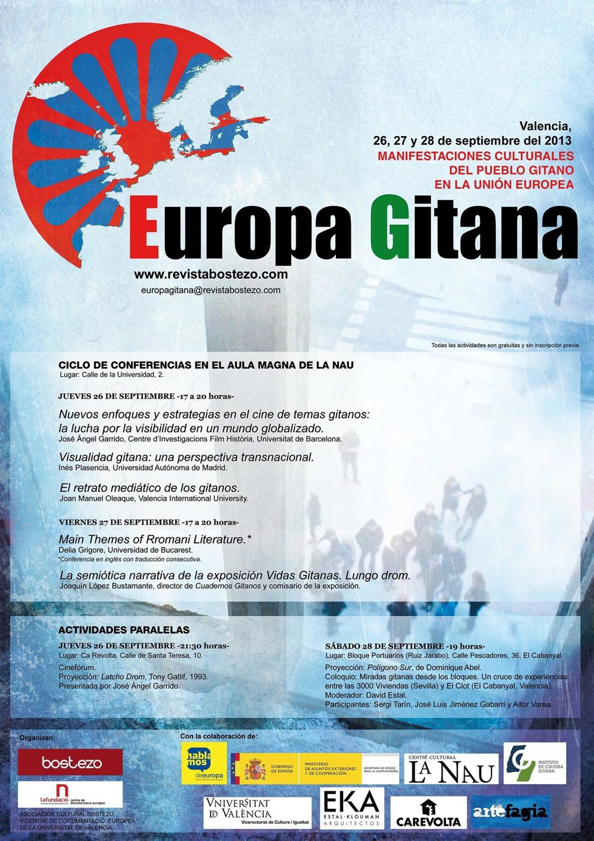 Organizadas por la revista 'Bostezo' y el Centro de Documentació Europea de la UV, las jornadas 'Europa Gitana', de carácter gratuito y sin inscripción previa, se insertan en el programa 'Hablamos de Europa' de la Secretaría de Estado para la Unión Europea, según ha informado la institución académica en un comunicado.