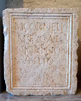 La pieza contiene la inscripción 'M CORNELIO M F GAL NIGRINO FILIO' y está dedicada al hijo del senador M. Cornelio Nigrino Curiato Materno, ilustre ciudadano de la antigua Edeta que llegó a aspirar al trono imperial compitiendo con Trajano.