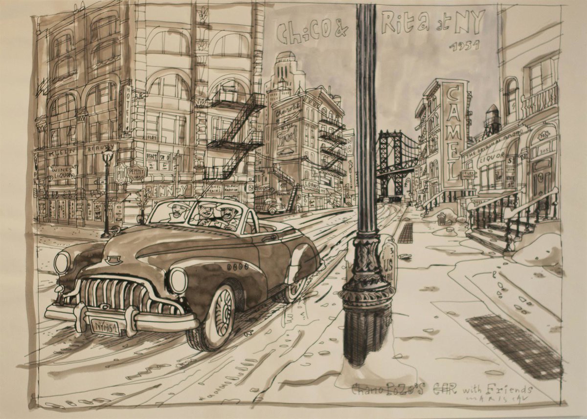 La selección que hasta el próximo 22 de marzo se puede contemplar en la Galería Punto reúne los primeros dibujos que Mariscal realizó sobre las calles de La Habana y Nueva York, así como los diferentes personajes y bocetos originales que sirvieron para ilustrar la película internacionalmente galardonada.