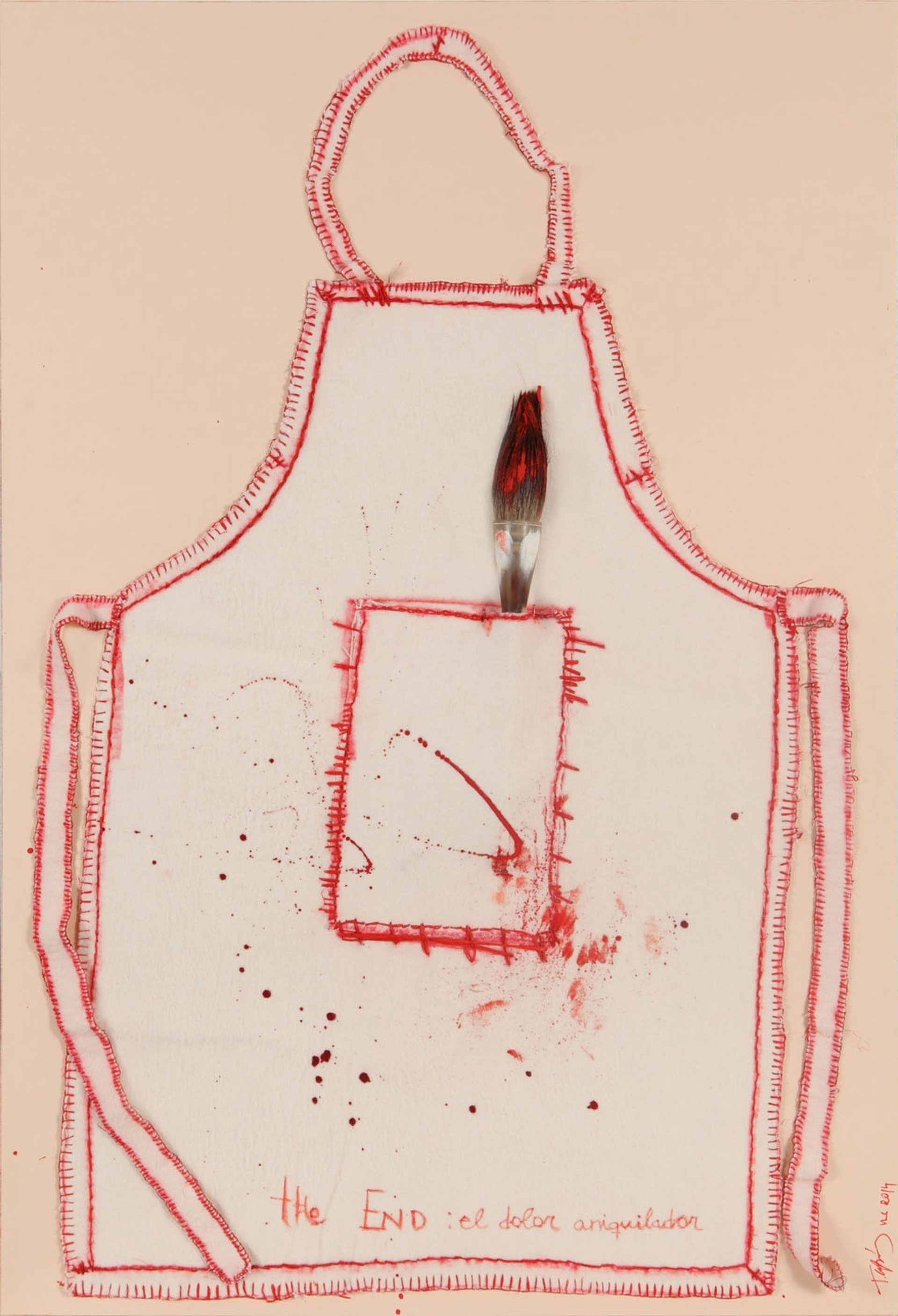 Entre las piezas de esta exposición se encuentra, a la entrada de la sala, un vestido de más de cuatro metros de ancho y altura, tejido con cables eléctricos de la artista Maribel Domènech. 'Para observar el mundo a una cierta distancia' invita a reflexionar sobre el empoderamiento de las mujeres a través de las nuevas tecnologías. La instalación que Rossana Zaera propone con 'El convite' muestra todo tipo de piezas de su abuela para hablar de un pasado "no siempre feliz". En la pieza, 'La máquina del tiempo' sustituye los hilos de una máquina de coser por sus cabellos.