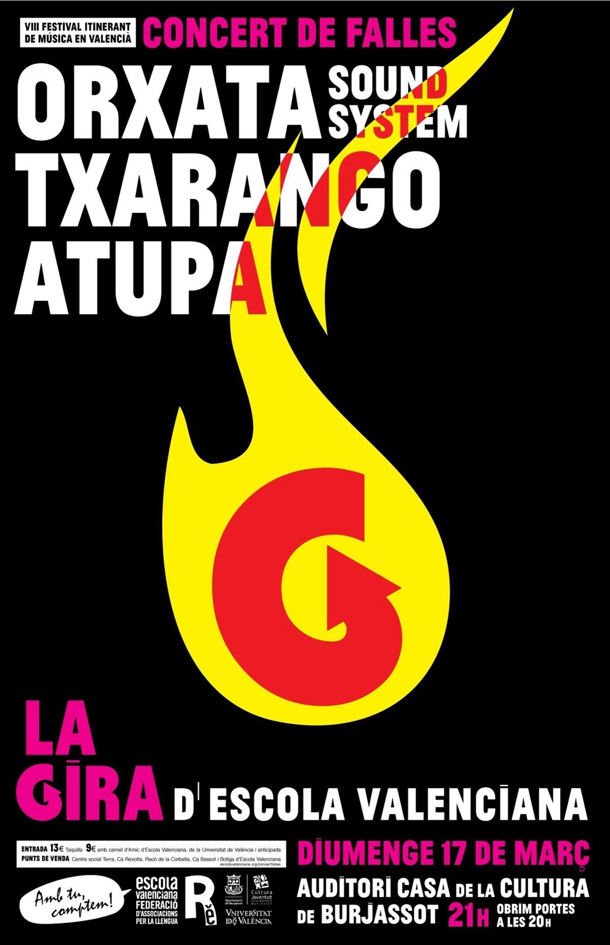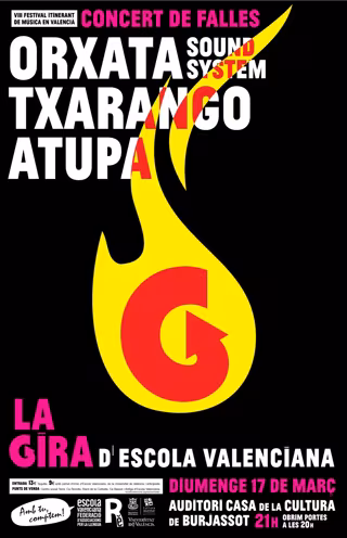 Los grupos de música Orxata Sound System, Txarango y Atupa garantizarán el fuego musical en la VIII edición del Festival Itinerant de Música en Valencià de Escola Valenciana, que arranca con el Concierto de Fallas el domingo 17 de marzo en el Auditorio de la Casa de la Cultura de Burjassot (Valencia), según ha informado este jueves la organización en un comunicado.