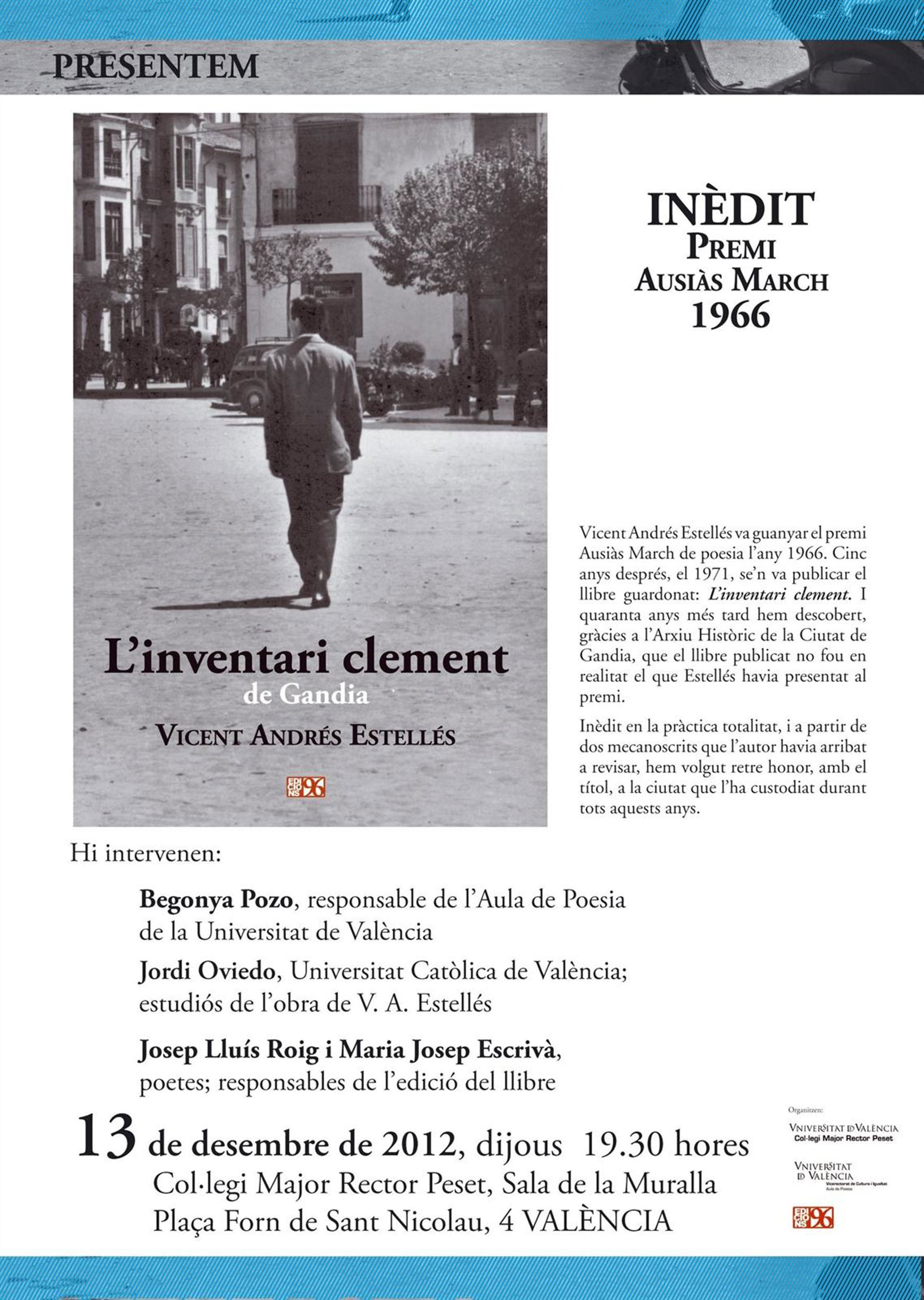 Vicent Andrés Estellés (Burjassot, l'Horta, 1924-València, 1993) fue periodista de profesión y está considerado como "el poeta más grande valenciano" desde el siglo XV, afirma la UV en un comunicado. Pero, hasta el año 1966, en el que presenta 'L'inventari clement' al premio Ausiàs March de Gandia, sólo había publicado 'Ciutat a cau d'orella', en 1953 ('Ciudad susurrada al oído' en traducción castellana), 'La nit' (1956), 'Donzell amarg' (1958) y 'L'amant de tota la vida' (1966).
