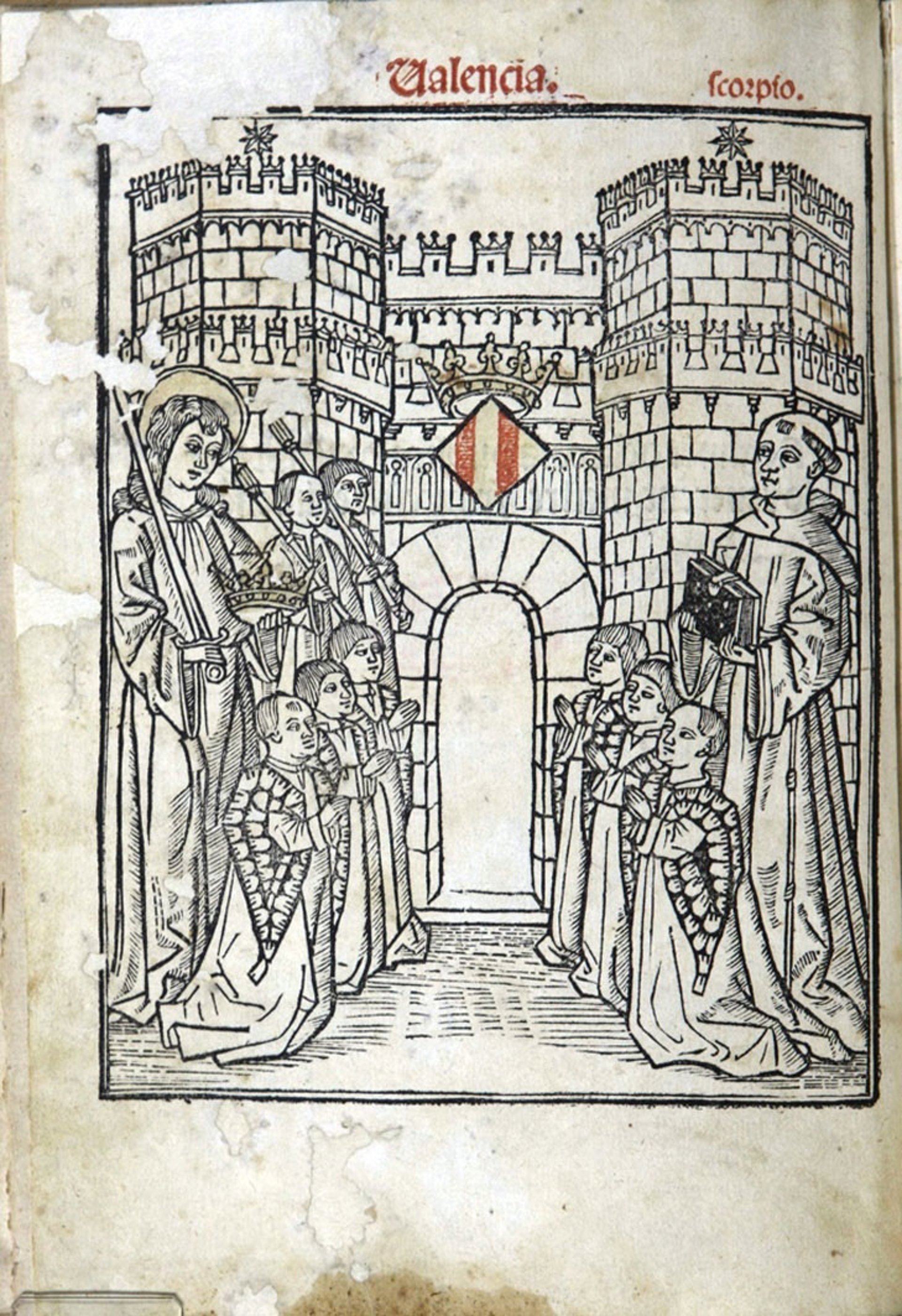 Asimismo, ha señalado que el grabado de este incunable representa la puerta gótica de las torres de Serranos de la antigua muralla de Valencia con los seis jurados de la ciudad arrodillados ante ella, mientras que a la derecha de la escena se muestra a Francesc Eiximenis que ofrece su libro a los jurados y a la izquierda, el ángel custodio de la ciudad y reino de Valencia.