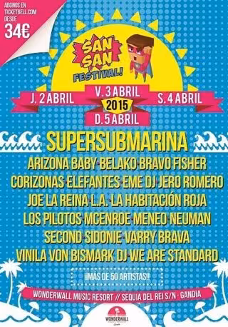 En esta segunda edición, SanSan vuelve a apostar por el talento nacional con un cartel que encabezará Supersubmarina, la banda formada por Chino, Pope, Jaime y Juanca que presentará por primera vez en un certamen su nuevo disco 'Blablabla'.