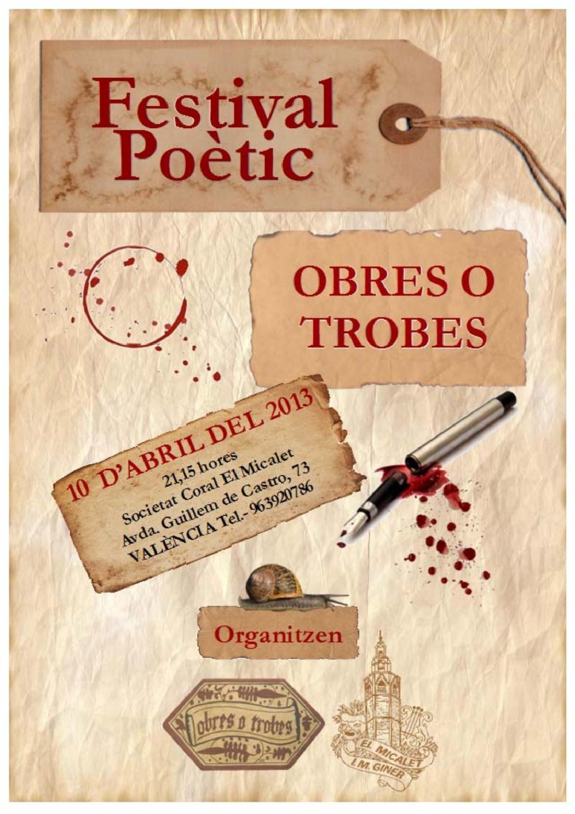 La Societat Coral el Micalet se convertirá este miércoles, a partir de las 22.30 horas, en la sede del festival poético 'Obres o Trobes', que organiza conjuntamente con la Associació Cultural Obres o Trobes. Se trata de un encuentro literario abiertp al público que contará con Amàlia Garrigós y Ferran Santonja Cerdà como conductores, donde Santonja también pondrá el acompañamiento musical, según ha informado la organización en un comunicado.