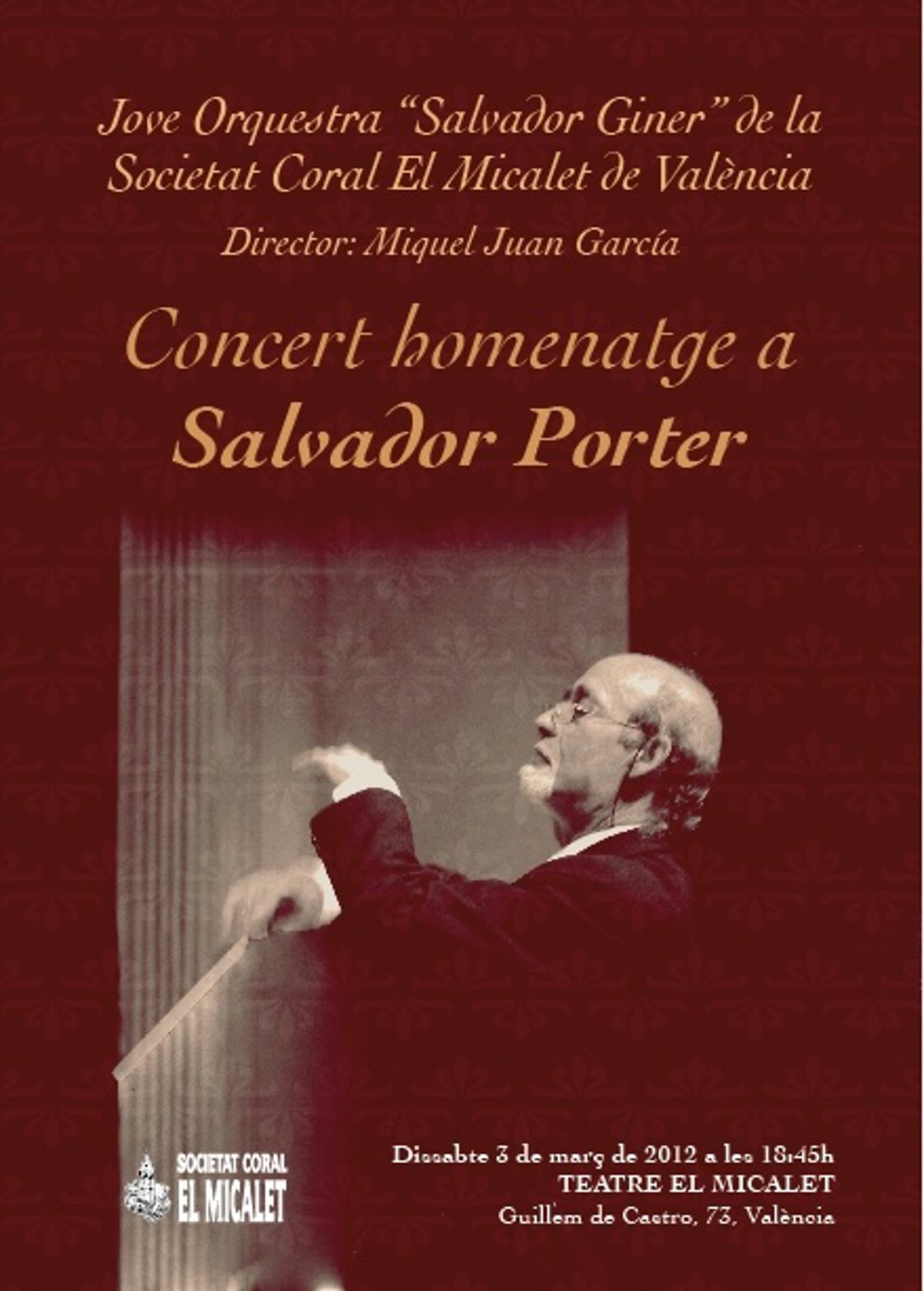 La Sociedad Coral El Micalet homenajeará esta sábado, en su teatro y a partir de las 18.45 horas, a Salvador Porter con un concierto que interpretará la Joven Orquesta 'Salvador Giner', bajo la batuta de Miquel Juan García, según ha informado la institución en comunicado.