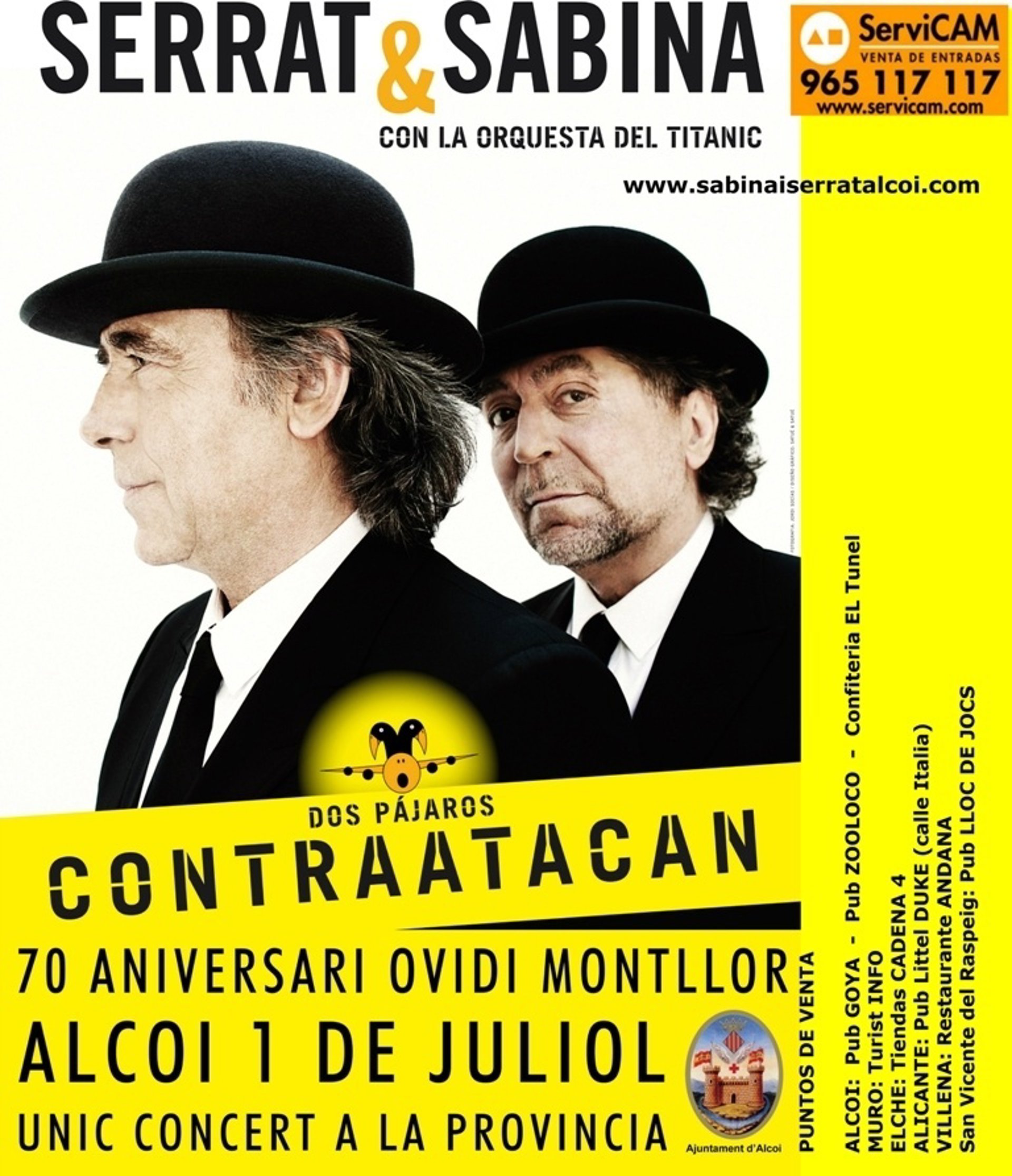 Los veteranos cantantes Joan Manuel Serrat y Joaquín Sabina actuarán el domingo 1 de julio en Alcoy (Alicante), en el Campo de El Collao, dentro de su gira 'Dos Pájaros Contraatacan', según ha informado la organización del evento en un comunicado.